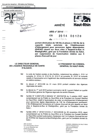 portant diminution de 146 lits et place à 140 lits de la capacité totale autorisée de l'établissement d'hébergement pour personnes âgées dépendantes (EHPAD) réparti sur deux sites à SEPPOIS LE BAS et WALDIGHOFFEN, géré par la Fondation Armée du Salut, par