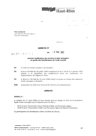 portant tarification des services d'aide ménagère au profit des bénéficiaires de l'aide sociale. Resumé Pièces jointes ARRETE Assemblée : Non défini Date : 06/03/2003 Rapporteur : Non défini Collectivité : Conseil départemental du Haut-Rhin Direction : Non défini Service : Direction Adjointe Personnes Agées et Personnes Handicapées Domaine : Autres (non classés) Commission :