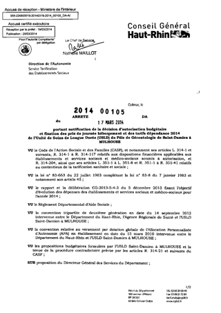 portant notification de la décision d'autorisation budgétaire et fixation des prix de journée hébergement et des tarifs dépendance 2014 de l'unité de soins de longue durée (USLD) du pôle de gérontologie de Saint-Damien à MULHOUSE. Resumé Pièces jointes ARRETE Assemblée : Non défini Date : 17/03/2014 Rapporteur : Non défini Collectivité : Conseil départemental du Haut-Rhin Direction : Non défini Service : Direction de l'Autonomie Domaine : Prix de Journée Commission :