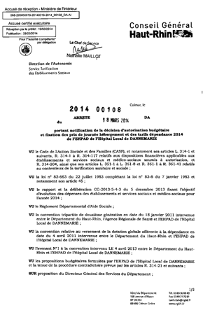 portant notification de la décision d'autorisation budgétaire et fixation des prix de journée hébergement et des tarifs dépendance 2014 de l'EHPAD de l'hôpital local de DANNEMARIE. Resumé Pièces jointes ARRETE Assemblée : Non défini Date : 18/03/2014 Rapporteur : Non défini Collectivité : Conseil départemental du Haut-Rhin Direction : Non défini Service : Direction de l'Autonomie Domaine : Prix de Journée Commission :
