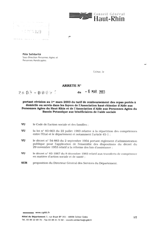 portant révision au 1er mars 2003 du tarif de remboursement des repas portés à domicile ou servis dans les foyers de l'Assoc. haut-rhinoise d'aide aux personnes âgées du Haut-Rhin et de l'Assoc. d'aide aux personnes âgées du Bassin Potassique Resumé Pièces jointes ARRETE Assemblée : Non défini Date : 06/03/2003 Rapporteur : Non défini Collectivité : Conseil départemental du Haut-Rhin Direction : Non défini Service : Direction Adjointe Personnes Agées et Personnes Handicapées Domaine : Autres (non classés) Commission :