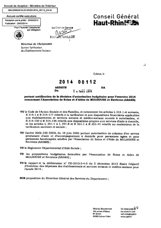 portant notification de la décision d'autorisation budgétaire pour l'exercice 2014 concernant l'association de soins et d'aides de MULHOUSE et Environs (ASAME). Resumé Pièces jointes ARRETE Assemblée : Non défini Date : 18/03/2014 Rapporteur : Non défini Collectivité : Conseil départemental du Haut-Rhin Direction : Non défini Service : Direction de l'Autonomie Domaine : Prix de Journée Commission :