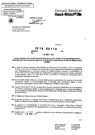 portant fixation des tarifs horaires 2014 du service d'aide et d'accompagnement à domicile pour les personnes âgées de la fédération association d'aide en milieu rural (ADMR). Resumé Pièces jointes ARRETE Assemblée : Non défini Date : 18/03/2014 Rapporteur : Non défini Collectivité : Conseil départemental du Haut-Rhin Direction : Non défini Service : Direction de l'Autonomie Domaine : Prix de Journée Commission :