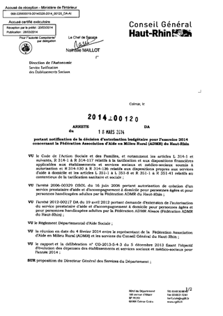 portant notification de la décision d'autorisation budgétaire pour l'exercice 2014 concernant la fédération association d'aide en milieu rural (ADMR) du Haut-Rhin. Resumé Pièces jointes ARRETE Assemblée : Non défini Date : 18/03/2014 Rapporteur : Non défini Collectivité : Conseil départemental du Haut-Rhin Direction : Non défini Service : Direction de l'Autonomie Domaine : Dotations financières Commission :
