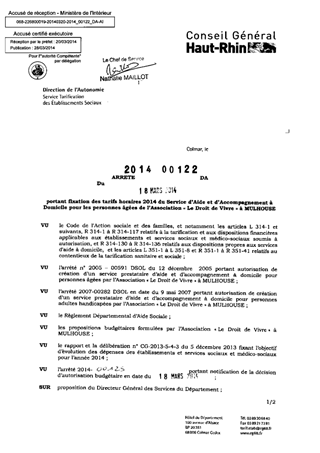 portant fixation des tarifs horaires 2014 du service d'aide et d'accompagnement à domicile pour les personnes âgées de l'association "Le Droit de Vivre" à MULHOUSE. Resumé Pièces jointes ARRETE Assemblée : Non défini Date : 18/03/2014 Rapporteur : Non défini Collectivité : Conseil départemental du Haut-Rhin Direction : Non défini Service : Direction de l'Autonomie Domaine : Prix de Journée Commission :