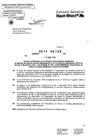 portant notification de la décision d'autorisation budgétaire et fixation du prix de journée hébergement et de la dotation dépendance 2014 du service d'accueil de jour "Les Moulins de l'Ill" à ZILLISHEIM de l'association de soins et d'aides Mulhouse et En