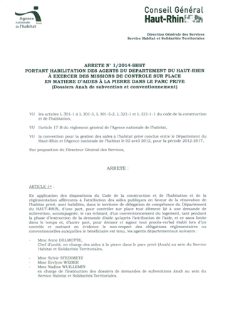 portant habilitation des agents du département du Haut-Rhin à exercer des missions de contrôle sur place en matière d'aides à la pierre dans le parc privé (dossiers ANAH de subvention et conventionnement). Resumé Pièces jointes ARRETE Assemblée : Non défini Date : 01/04/2014 Rapporteur : Non défini Collectivité : Conseil départemental du Haut-Rhin Direction : Non défini Service : Direction de l'Autonomie Domaine : Autres (non classés) Commission :