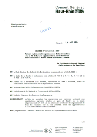 portant réglementation permanente de la circulation sur le RD 1 III, hors agglomération, sur le territoire des communes de ALGOLSHEIM et OBERSAASHEIM. Resumé Pièces jointes ARRETE Assemblée : Non défini Date : 16/04/2014 Rapporteur : Non défini Collectivité : Conseil départemental du Haut-Rhin Direction : Non défini Service : Direction des Routes Domaine : Circulation Commission :