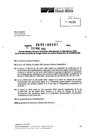 portant fixation des prix de journée hébergement et dépendance 2003 de la section de soins de longue durée du centre hospitalier de GUEBWILLER. Resumé Pièces jointes ARRETE Assemblée : Non défini Date : 10/03/2003 Rapporteur : Non défini Collectivité : Conseil départemental du Haut-Rhin Direction : Non défini Service : Direction de la Solidarité Domaine : Prix de Journée Commission :