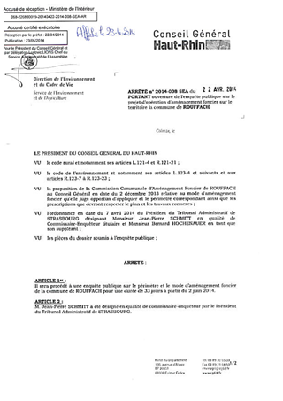 portant ouverture de l'enquête publique sur le projet d'opération d'aménagement foncier sur le territoire de la commune de ROUFFACH. Resumé Pièces jointes ARRETE Assemblée : Non défini Date : 22/04/2014 Rapporteur : Non défini Collectivité : Conseil départemental du Haut-Rhin Direction : Non défini Service : Direction de l'Environnement et du Cadre de Vie Domaine : Autres (non classés) Commission :