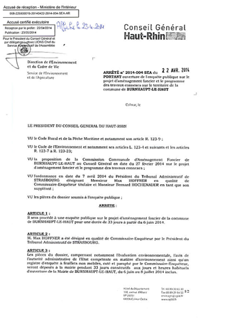 portant ouverture de l'enquête publique sur le projet d'aménagement foncier et le programme des travaux connexes sur le territoire de la commune de BURNHAUPT LE HAUT. Resumé Pièces jointes ARRETE Assemblée : Non défini Date : 22/04/2014 Rapporteur : Non défini Collectivité : Conseil départemental du Haut-Rhin Direction : Non défini Service : Direction de l'Environnement et du Cadre de Vie Domaine : Autres (non classés) Commission :