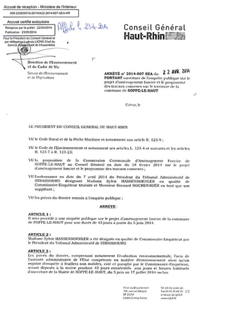 portant ouverture de l'enquête publique sur le projet d'aménagement foncier et le programme des travaux connexes sur le territoire de la commune de SOPPE LE HAUT. Resumé Pièces jointes ARRETE Assemblée : Non défini Date : 22/04/2014 Rapporteur : Non défini Collectivité : Conseil départemental du Haut-Rhin Direction : Non défini Service : Direction de l'Environnement et du Cadre de Vie Domaine : Autres (non classés) Commission :