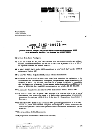 portant fixation des prix de journée hébergement et dépendance 2003 de la maison de retraite "Les Erables" de GUEBWILLER. Resumé Pièces jointes ARRETE Assemblée : Non défini Date : 10/03/2003 Rapporteur : Non défini Collectivité : Conseil départemental du Haut-Rhin Direction : Non défini Service : Direction de la Solidarité Domaine : Prix de Journée Commission :