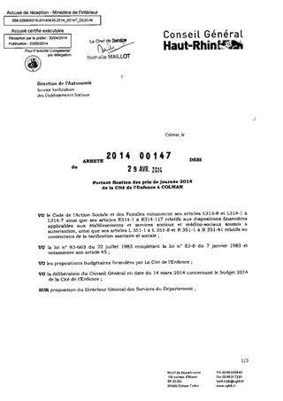 portant fixation des prix de journée 2014 de la Cité de l'Enfance à COLMAR. Resumé Pièces jointes ARRETE Assemblée : Non défini Date : 29/04/2014 Rapporteur : Non défini Collectivité : Conseil départemental du Haut-Rhin Direction : Non défini Service : Direction de l'Autonomie Domaine : Prix de Journée Commission :