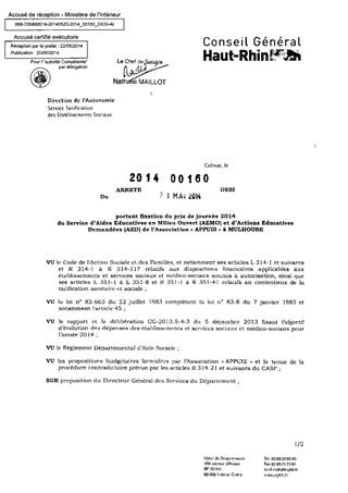 portant fixation du prix de journée 2014 du service d'aides éducatives en milieu ouvert (AEMO) et d'actions éducatives demandées (AED) de l'association "APPUIS" à MULHOUSE. Resumé Pièces jointes ARRETE Assemblée : Non défini Date : 21/05/2014 Rapporteur : Non défini Collectivité : Conseil départemental du Haut-Rhin Direction : Non défini Service : Direction de l'Autonomie Domaine : Prix de Journée Commission :