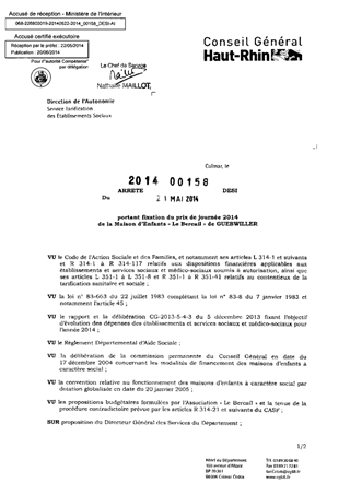 portant fixation du prix de journée 2014 de la Maison d'Enfants "Le Bercail" de GUEBWILLER. Resumé Pièces jointes ARRETE Assemblée : Non défini Date : 21/05/2014 Rapporteur : Non défini Collectivité : Conseil départemental du Haut-Rhin Direction : Non défini Service : Direction de l'Autonomie Domaine : Prix de Journée Commission :