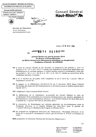 portant fixation du prix de journée 2014 du service d'action éducative en milieu ouvert avec hébergement périodique ou exceptionnel "Fondation d'Auteuil" de COLMAR. Resumé Pièces jointes ARRETE Assemblée : Non défini Date : 26/05/2014 Rapporteur : Non défini Collectivité : Conseil départemental du Haut-Rhin Direction : Non défini Service : Direction de l'Autonomie Domaine : Prix de Journée Commission :