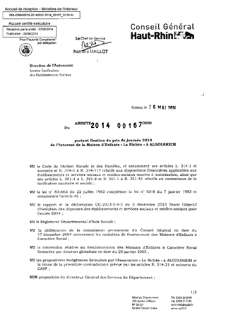 portant fixation du prix de journée 2014 de l'Internat de la Maison d'Enfants "La Nichée" à ALGOLSHEIM. Resumé Pièces jointes ARRETE Assemblée : Non défini Date : 26/05/2014 Rapporteur : Non défini Collectivité : Conseil départemental du Haut-Rhin Direction : Non défini Service : Direction de l'Autonomie Domaine : Prix de Journée Commission :