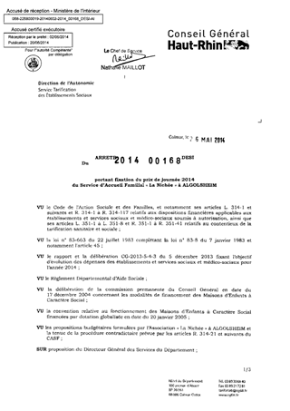 portant fixation du prix de journée 2014 du service d'accueil familial "La Nichée" à ALGOLSHEIM. Resumé Pièces jointes ARRETE Assemblée : Non défini Date : 26/05/2014 Rapporteur : Non défini Collectivité : Conseil départemental du Haut-Rhin Direction : Non défini Service : Direction de l'Autonomie Domaine : Prix de Journée Commission :