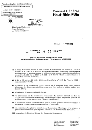 portant fixation du prix de journée 2014 de la Pouponnière de l'association "l'Ermitage" de MULHOUSE. Resumé Pièces jointes ARRETE Assemblée : Non défini Date : 26/05/2014 Rapporteur : Non défini Collectivité : Conseil départemental du Haut-Rhin Direction : Non défini Service : Direction de l'Autonomie Domaine : Prix de Journée Commission :