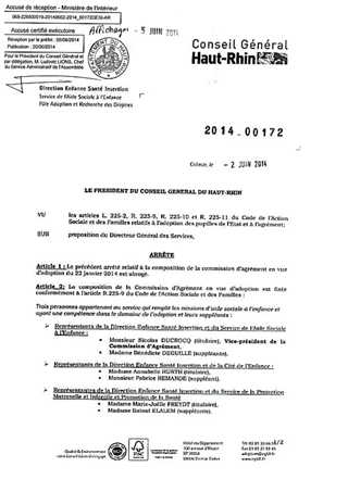 relatif à la composition de la commission d'agrément en vue d'adoption. Resumé Pièces jointes ARRETE Assemblée : Non défini Date : 02/06/2014 Rapporteur : Non défini Collectivité : Conseil départemental du Haut-Rhin Direction : Non défini Service : Direction Enfance Santé Insertion Domaine : Autres (non classés) Commission :