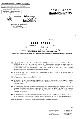 portant notification de la décision d'autorisation budgétaire et fixation de la dotation globalisée 2014 du service d'accueil de jour de l'association "Solidarité du Rhin" à NEUF-BRISACH. Resumé Pièces jointes ARRETE Assemblée : Non défini Date : 02/06/2014 Rapporteur : Non défini Collectivité : Conseil départemental du Haut-Rhin Direction : Non défini Service : Direction de l'Autonomie Domaine : Dotations financières Commission :