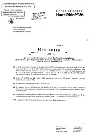 portant notification de la décision d'autorisation budgétaire et fixation du prix de journée 2014 du foyer d'accueil spécialisé de l'association "Croix-Marine" à WITTENHEIM. Resumé Pièces jointes ARRETE Assemblée : Non défini Date : 04/06/2014 Rapporteur : Non défini Collectivité : Conseil départemental du Haut-Rhin Direction : Non défini Service : Direction de l'Autonomie Domaine : Prix de Journée Commission :