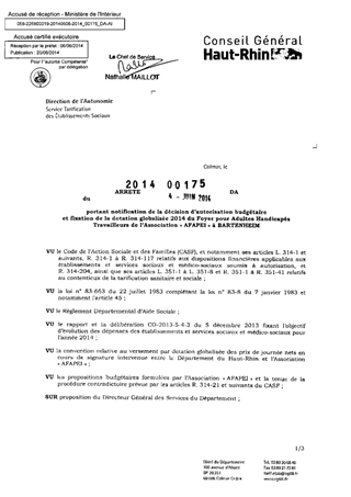 portant notification de la décision d'autorisation budgétaire et fixation de la dotation globalisée 2014 du foyer pour adultes handicapés travailleurs de l'association "AFAPEI" à BARTENHEIM. Resumé Pièces jointes ARRETE Assemblée : Non défini Date : 04/06/2014 Rapporteur : Non défini Collectivité : Conseil départemental du Haut-Rhin Direction : Non défini Service : Direction de l'Autonomie Domaine : Dotations financières Commission :