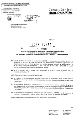 portant notification de la décision d'autorisation budgétaire et fixation de la dotation globalisée 2014 du service d'accueil de jour de l'association "AFAPEI" à BARTENHEIM. Resumé Pièces jointes ARRETE Assemblée : Non défini Date : 04/06/2014 Rapporteur : Non défini Collectivité : Conseil départemental du Haut-Rhin Direction : Non défini Service : Direction de l'Autonomie Domaine : Dotations financières Commission :