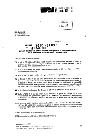 portant fixation des prix de journée hébergement et dépendance 2003 de la Résidence "René Hirschler" de PFASTATT. Resumé Pièces jointes ARRETE Assemblée : Non défini Date : 10/03/2003 Rapporteur : Non défini Collectivité : Conseil départemental du Haut-Rhin Direction : Non défini Service : Direction de la Solidarité Domaine : Prix de Journée Commission :