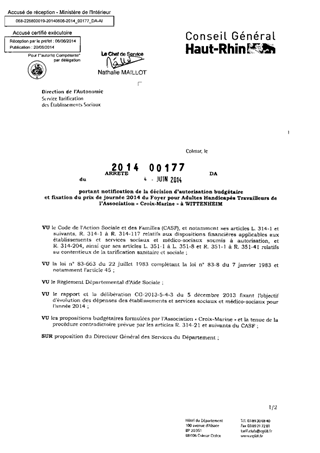 portant notification de la décision d'autorisation budgétaire et fixation du prix de journée 2014 du foyer pour adultes handicapés travailleurs de l'association "Croix-Marine" à WITTENHEIM. Resumé Pièces jointes ARRETE Assemblée : Non défini Date : 04/06/2014 Rapporteur : Non défini Collectivité : Conseil départemental du Haut-Rhin Direction : Non défini Service : Direction de l'Autonomie Domaine : Prix de Journée Commission :