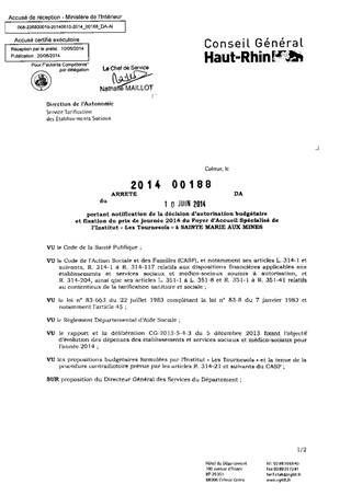 portant notification de la décision d'autorisation budgétaire et fixation du prix de journée 2014 du foyer d'accueil spécialisé de l'institut "Les Tournesols" à SAINTE MARIE AUX MINES. Resumé Pièces jointes ARRETE Assemblée : Non défini Date : 10/06/2014 Rapporteur : Non défini Collectivité : Conseil départemental du Haut-Rhin Direction : Non défini Service : Direction de l'Autonomie Domaine : Prix de Journée Commission :