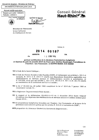 portant notification de la décision d'autorisation budgétaire et fixation du prix de journée 2014 du foyer pour adultes handicapés travailleurs de l'institut "Les Tournesols" à SAINTE MARIE AUX MINES. Resumé Pièces jointes ARRETE Assemblée : Non défini Date : 10/06/2014 Rapporteur : Non défini Collectivité : Conseil départemental du Haut-Rhin Direction : Non défini Service : Direction de l'Autonomie Domaine : Prix de Journée Commission :