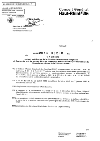 portant notification de la décision d'autorisation budgétaire et fixation du prix de journée 2014 du foyer pour adultes handicapés travailleurs de l'association "l'Atre de la Vallée" à ORBEY. Resumé Pièces jointes ARRETE Assemblée : Non défini Date : 17/06/2014 Rapporteur : Non défini Collectivité : Conseil départemental du Haut-Rhin Direction : Non défini Service : Direction de l'Autonomie Domaine : Prix de Journée Commission :