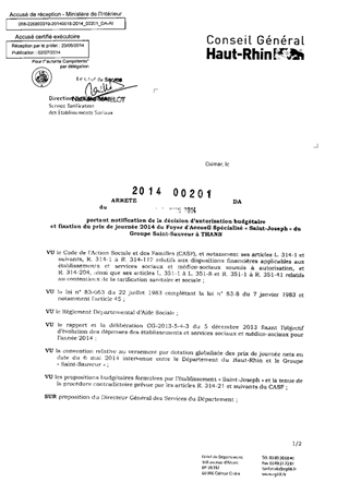portant notification de la décision d'autorisation budgétaire et fixation du prix de journée 2014 du foyer d'accueil spécialisé "Saint-Joseph" du groupe Saint-Sauveur à THANN. Resumé Pièces jointes ARRETE Assemblée : Non défini Date : 17/06/2014 Rapporteur : Non défini Collectivité : Conseil départemental du Haut-Rhin Direction : Non défini Service : Direction de l'Autonomie Domaine : Prix de Journée Commission :
