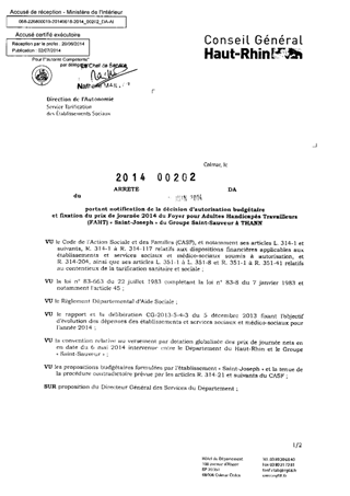 portant notification de la décision d'autorisation budgétaire et fixation du prix de journée 2014 du foyer pour adultes handicapés travailleurs (FAHT) "Saint-Joseph" du groupe Saint-Sauveur à THANN. Resumé Pièces jointes ARRETE Assemblée : Non défini Date : 17/06/2014 Rapporteur : Non défini Collectivité : Conseil départemental du Haut-Rhin Direction : Non défini Service : Direction de l'Autonomie Domaine : Prix de Journée Commission :