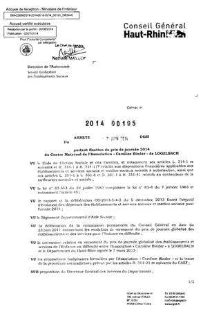 portant fixation du prix de journée 2014 du centre maternel de l'association "Caroline Binder" de LOGELBACH. Resumé Pièces jointes ARRETE Assemblée : Non défini Date : 17/06/2014 Rapporteur : Non défini Collectivité : Conseil départemental du Haut-Rhin Direction : Non défini Service : Direction de l'Autonomie Domaine : Prix de Journée Commission :