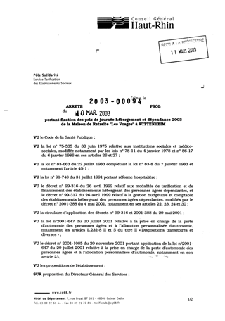 portant fixation des prix de journée hébergement et dépendance 2003 de la maison de retraite "Les Vosges" à WITTENHEIM. Resumé Pièces jointes ARRETE Assemblée : Non défini Date : 10/03/2003 Rapporteur : Non défini Collectivité : Conseil départemental du Haut-Rhin Direction : Non défini Service : Direction de la Solidarité Domaine : Prix de Journée Commission :