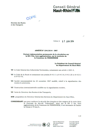 portant réglementation permanente de la circulation sur la RD 3 bis, hors agglomération, sur le territoire de la commune de FESSENHEIM. Resumé Pièces jointes ARRETE Assemblée : Non défini Date : 17/06/2014 Rapporteur : Non défini Collectivité : Conseil départemental du Haut-Rhin Direction : Non défini Service : Direction des Routes Domaine : Circulation Commission :