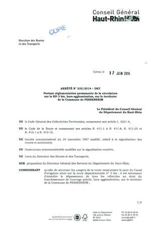 portant réglementation permanente de la circulation sur la RD 3 bis, hors agglomération, sur le territoire de la commune de FESSENHEIM. Resumé Pièces jointes ARRETE Assemblée : Non défini Date : 17/06/2014 Rapporteur : Non défini Collectivité : Conseil départemental du Haut-Rhin Direction : Non défini Service : Direction des Routes Domaine : Circulation Commission :