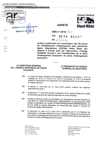 portant modification de l'autorisation de 52 places de l'établissement d'hébergement pour personnes âgées dépendantes (EHPAD) Notre Dame des Apôtres à COLMAR, géré par l'association "Partage Solidarité Accueil", par requalification de la place d'hébergeme