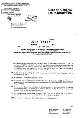 portant notification de la décision d'autorisation budgétaire et fixation de la dotation globalisée 2014 du service d'accompagnement à la vie sociale de l'association des paralysés de France (APF) à MULHOUSE. Resumé Pièces jointes ARRETE Assemblée : Non défini Date : 25/06/2014 Rapporteur : Non défini Collectivité : Conseil départemental du Haut-Rhin Direction : Non défini Service : Direction de l'Autonomie Domaine : Dotations financières Commission :