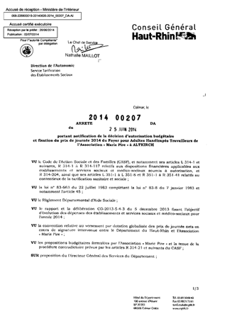 portant notification de la décision d'autorisation budgétaire et fixation du prix de journée 2014 du foyer pour adultes handicapés travailleurs de l'association "Marie Pire" à ALTKIRCH. Resumé Pièces jointes ARRETE Assemblée : Non défini Date : 25/06/2014 Rapporteur : Non défini Collectivité : Conseil départemental du Haut-Rhin Direction : Non défini Service : Direction de l'Autonomie Domaine : Prix de Journée Commission :