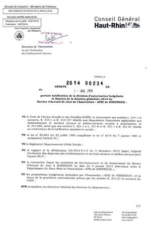 portant notification de la décision d'autorisation budgétaire et fixation de la dotation globalisée 2014 du service de'accueil de jour de l'association "APEI de HIRSINGUE. Resumé Pièces jointes ARRETE Assemblée : Non défini Date : 01/07/2014 Rapporteur : Non défini Collectivité : Conseil départemental du Haut-Rhin Direction : Non défini Service : Direction de l'Autonomie Domaine : Dotations financières Commission :
