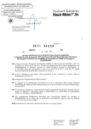 portant notification de la décision d'autorisation budgétaire et fixation du prix de journée 2014 du foyer d'accueil spécialisé pour personnes handicapées vieillissantes (FASPHV) de l'association APAEI du Sundgau à DANNEMARIE. Resumé Pièces jointes ARRETE Assemblée : Non défini Date : 03/07/2014 Rapporteur : Non défini Collectivité : Conseil départemental du Haut-Rhin Direction : Non défini Service : Direction de l'Autonomie Domaine : Prix de Journée Commission :