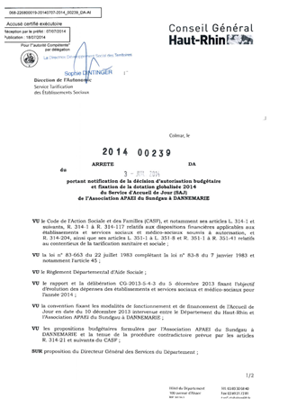 portant notification de la décision d'autorisation budgétaire et fixation de la dotation globalisée 2014 du service d'accueil de jour (SAJ) de l'association APAEI du Sundgau à DANNEMARIE. Resumé Pièces jointes ARRETE Assemblée : Non défini Date : 03/07/2014 Rapporteur : Non défini Collectivité : Conseil départemental du Haut-Rhin Direction : Non défini Service : Direction de l'Autonomie Domaine : Dotations financières Commission :