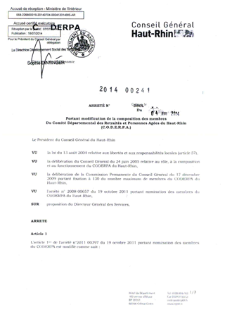 portant modificatiion de la composition des membres du comité départemental des retraités et personnes âgées du Haut-Rhin (C.O.D.E.R.P.A.) Resumé Pièces jointes ARRETE Assemblée : Non défini Date : 04/07/2014 Rapporteur : Non défini Collectivité : Conseil départemental du Haut-Rhin Direction : Non défini Service : Direction de l'Autonomie Domaine : Personnes Agées Commission :