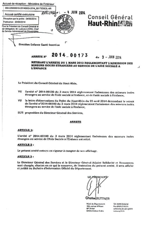 arrêté retirant l'arrêté du 1er mars 2013 réglementant l'admission des mineurs isolés étrangers au service de l'aide sociale à l'enfance. Resumé Pièces jointes ARRETE Assemblée : Non défini Date : 08/07/2014 Rapporteur : Non défini Collectivité : Conseil départemental du Haut-Rhin Direction : Non défini Service : Direction Enfance Santé Insertion Domaine : Autres (non classés) Commission :