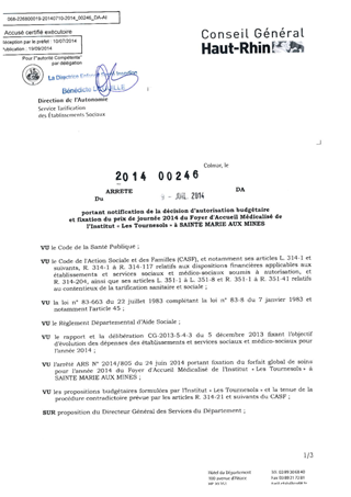 portant notification de la décision d'autorisation budgétaire et fixation du prix de journée 2014 du foyer d'accueil médicalisé de l'Institut "Les Tournesols" à SAINTE MARIE AUX MINES. Resumé Pièces jointes ARRETE Assemblée : Non défini Date : 09/07/2014 Rapporteur : Non défini Collectivité : Conseil départemental du Haut-Rhin Direction : Non défini Service : Direction de l'Autonomie Domaine : Prix de Journée Commission :