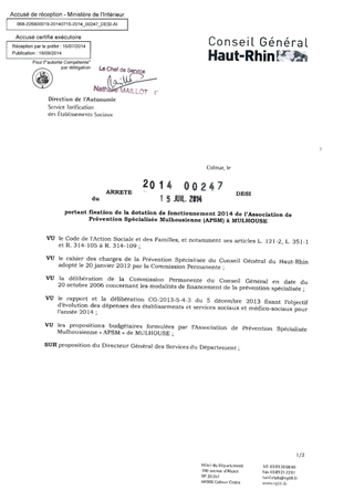 portant fixation de la dotation de fonctionnement 2014 de l'association de prévention spécialisée mulhousienne (APSM) à MULHOUSE. Resumé Pièces jointes ARRETE Assemblée : Non défini Date : 15/07/2014 Rapporteur : Non défini Collectivité : Conseil départemental du Haut-Rhin Direction : Non défini Service : Direction de l'Autonomie Domaine : Dotations financières Commission :